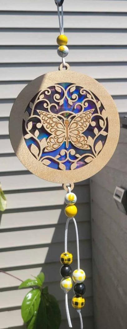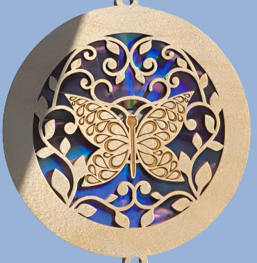 Brighten up your room with this Wooden Laser Cut DVD Suncatcher, light reflector. It is made up of laser cut Baltic birch, and then spray coated with a clear coat to help protect the wood. The DVD creates a brilliant shine inserted back-to-back between the two wooden layers. The DVD shows a brilliant display of beautiful rainbow colors. It hangs by a white suede cord with wooden beads. Hang it anywhere indoors where any kind of light is present. It doesn't have to be in the sun to reflect its beautiful colors.